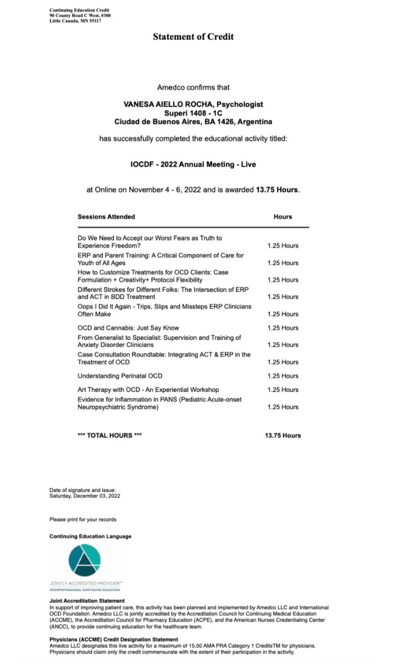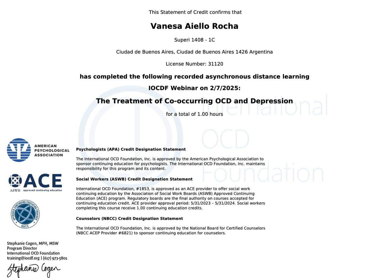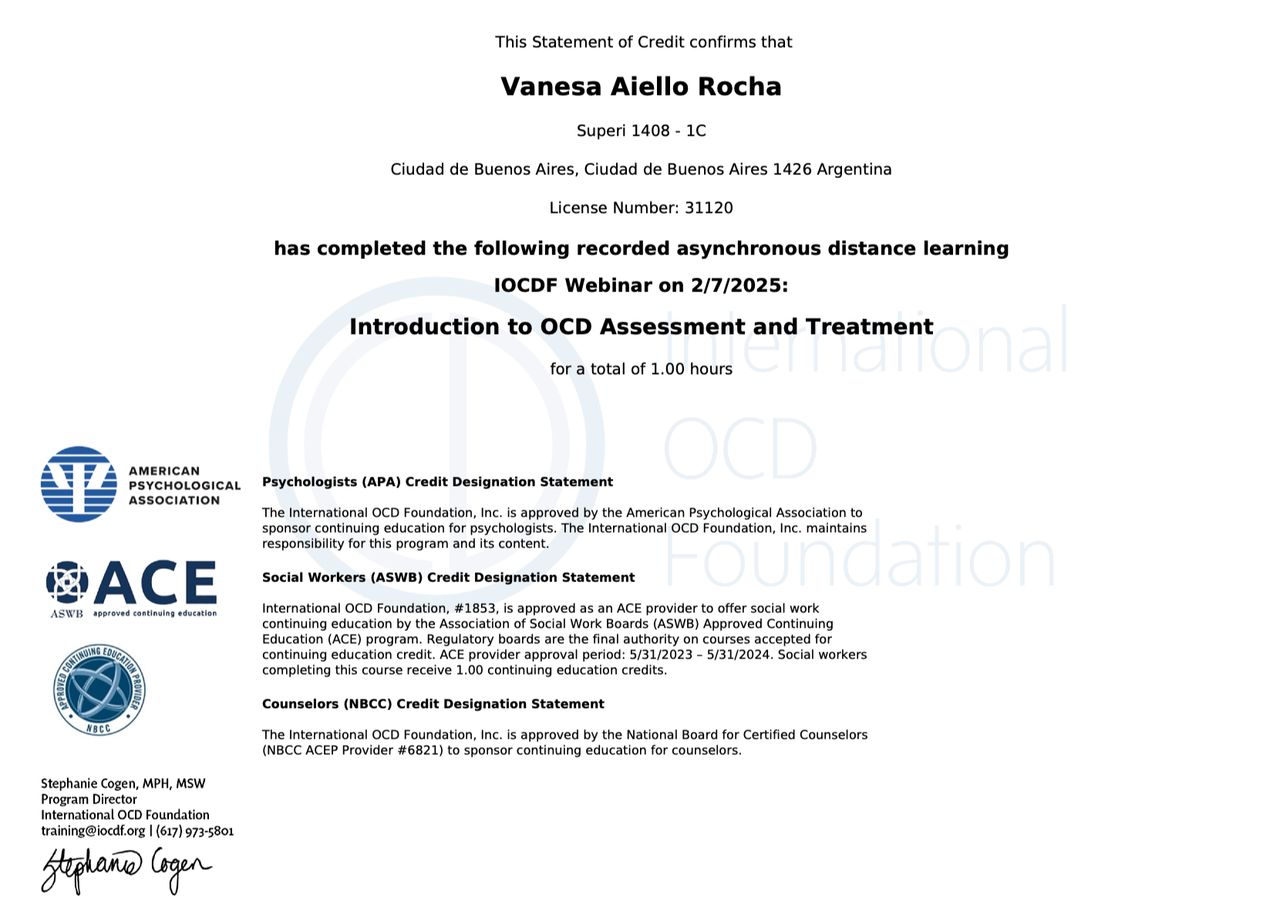 Me ayudó mucho durante la pandemia con mi tratamiento para el TOC, trabajando en conjunto con otros psicólogos y psiquiatras. Le estoy muy agradecido.